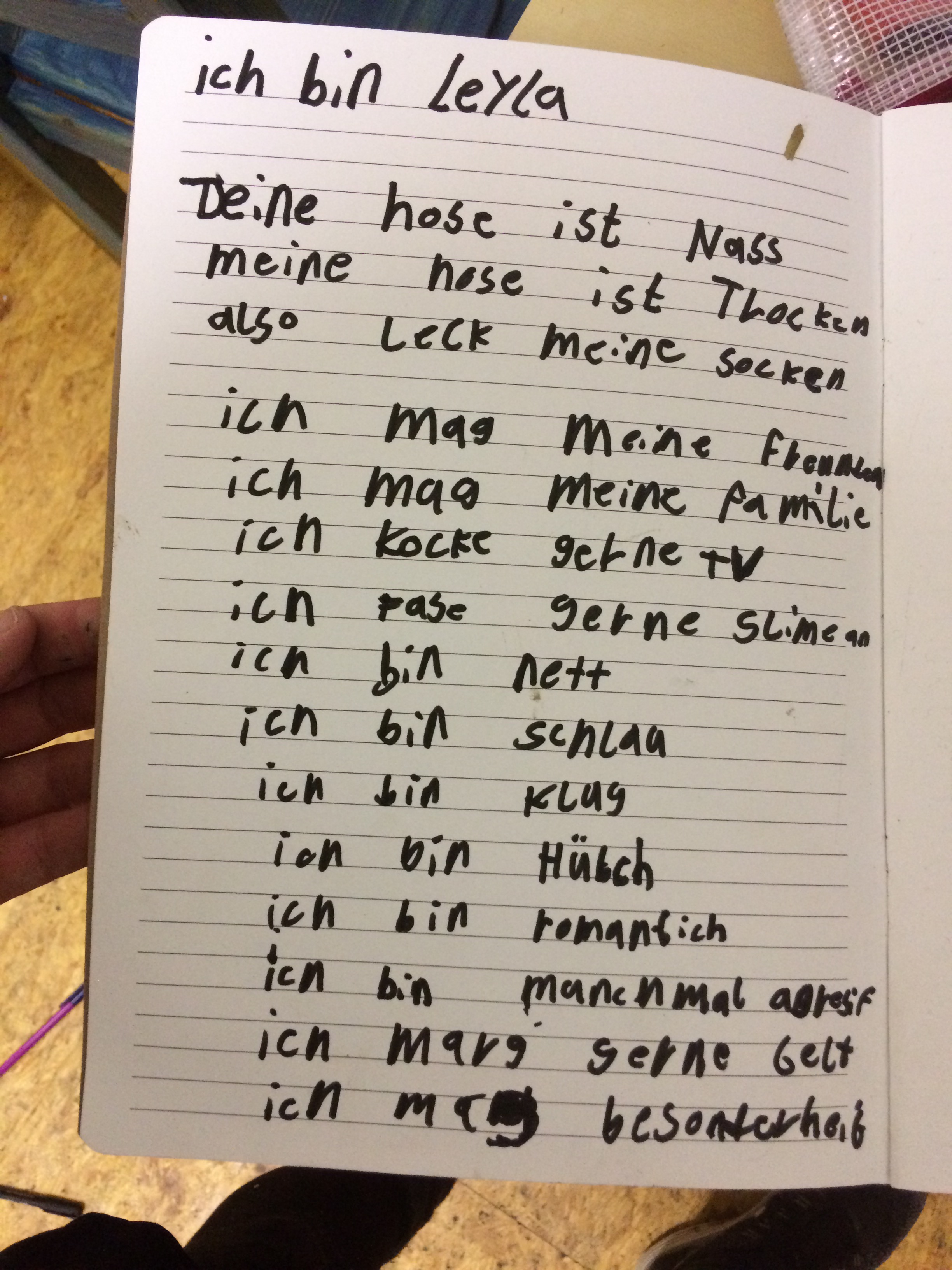 In wöchentlichen Workshoptreffen haben wir rund um die Themen Selbstdarstellung, Wünsche und Visionen gearbeitet. Die Teilnehmenden haben durch Schreib- und Dialogübungen ihre eigenen Visionen und Wünsche für das Leben jetzt und in der Zukunft erforscht. Sie haben im Verlauf der unterschiedlichen Workshoptreffen mehrere kurze Texte verfasst, die sie durch Austausch in der Gruppe reflektiert und beschrieben haben, was sie über den Text kommunizieren wollten. Die Texte, die während der Workshops entwickelt wurden, sowie weitere Reflexionen, die in dieser Zeit entstanden sind und Fotos vom Arbeitsprozess, sind hier in Form einer öffentlichen digitalen Ausstellung zu sehen.
