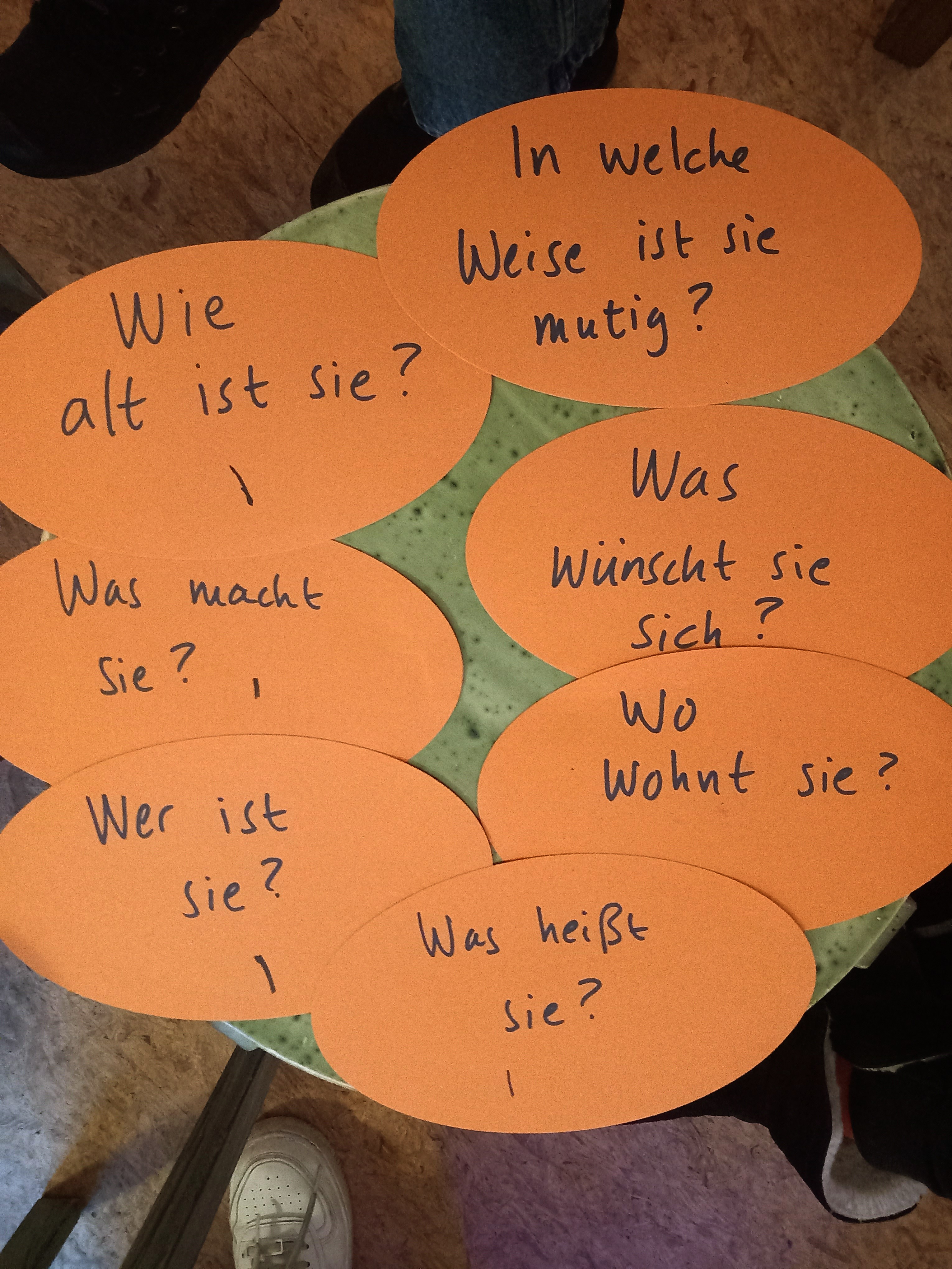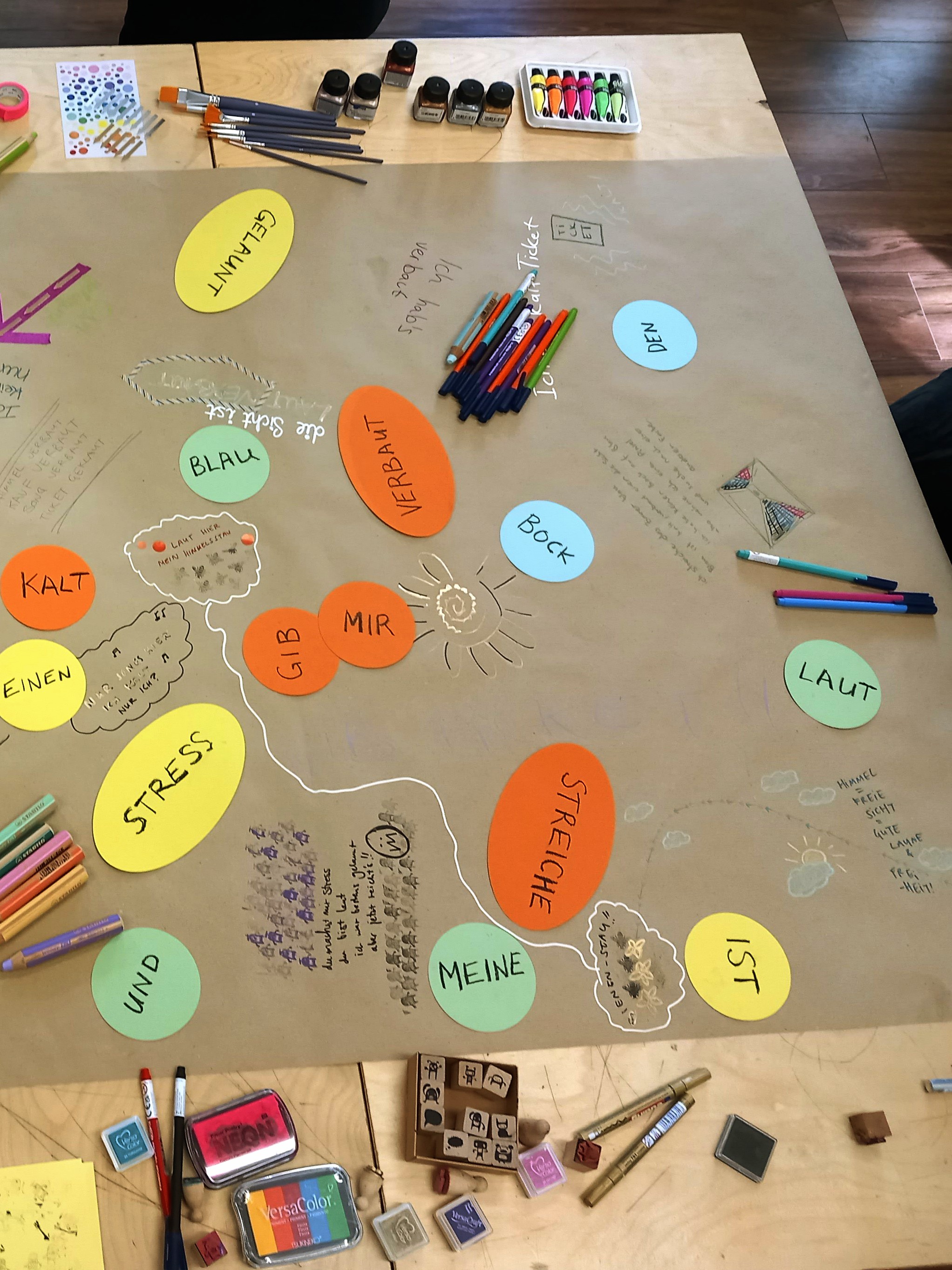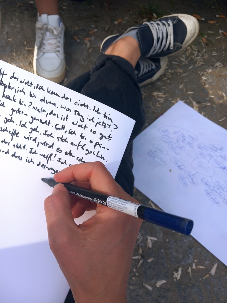 Wir benutzten verschiedene Methoden des kreativen Schreibens Techniken wie das Erstellen von Clustern, um mehr Tiefe und Möglichkeiten beim Schreiben von Geschichten zu erhalten. Durch Körper- und Darstellungsarbeiten fanden wir Mut, sich selbst zu zeigen und klare Positionen einzunehmen.