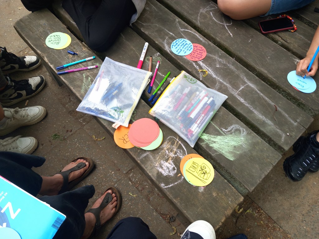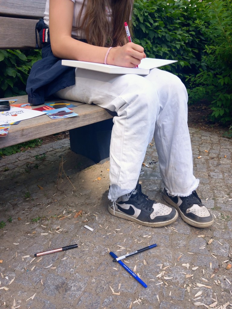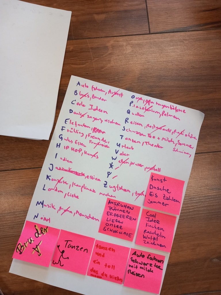 Nach den Sommerferien begannen wir mit einem beliebten Spiel – dem Worteschenken. Jeder durfte ein Wort beitragen und erhielt dafür ein Stück Pizza. Gemeinsam in der Gruppe nutzten wir diese Wörter, um witzige Redewendungen und Sprüche zu gestalten. Auch analysierten wir bekannte Reime und Sätze aus Literatur und Musik (wie z.B. der bei den Mädchen beliebten Rapperin Nina Chuba) und schufen eigene Reime und Gedichte. Der Fokus lag dabei auf Spaß, Freude am Schreiben und dem Experimentieren, um eine inspirierende Atmosphäre zu schaffen und neue kreative Wege zu erkunden.