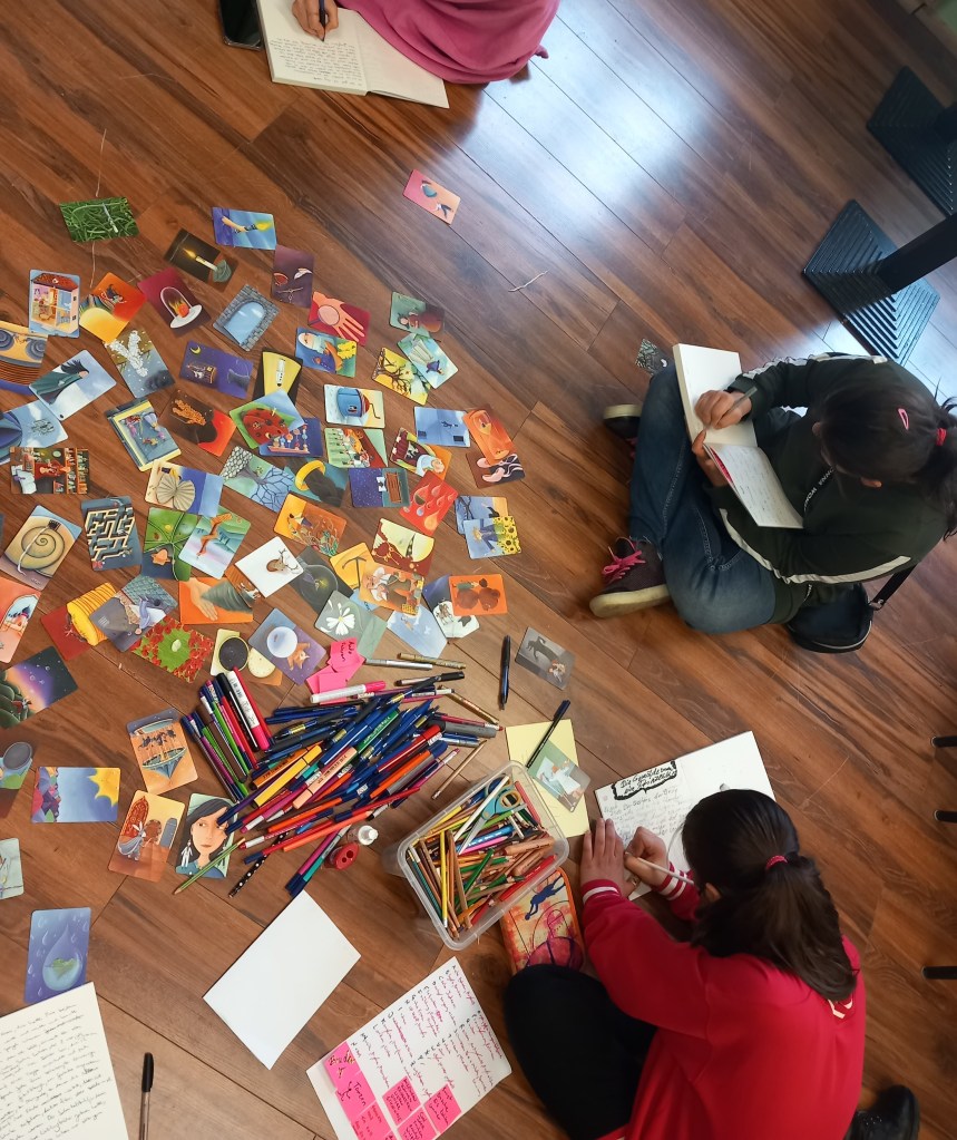 In den Osterferien starteten wir unseren ersten Workshop mit dem Fokus, dass wir in der Gruppe Vertrauen aufbauen, wir uns in der Gruppe wohl fühlen und wir uns untereinander kennenlernen. Wir nutzten kreative Methoden, wie das Betrachten von Bildern, um imaginative Geschichten zu entwickeln. Mutig lasen die Teilnehmerinnen ihre Geschichten vor, tauschten sich über deren Wirkung aus. Nach jeder Geschichte erhielten die Teilnehmerinnen Wortgeschenke, die dazu einladen nicht zu bewertenn, sondern tiefer zu reflektieren, was auf sie wirkte. Die Workshops waren geprägt von Schreib- und Improvisationspielen (wie dem ABCDarium oder Assoziationsspielen), Spaß und schufen eine solide Basis für die folgenden Workshoptage.