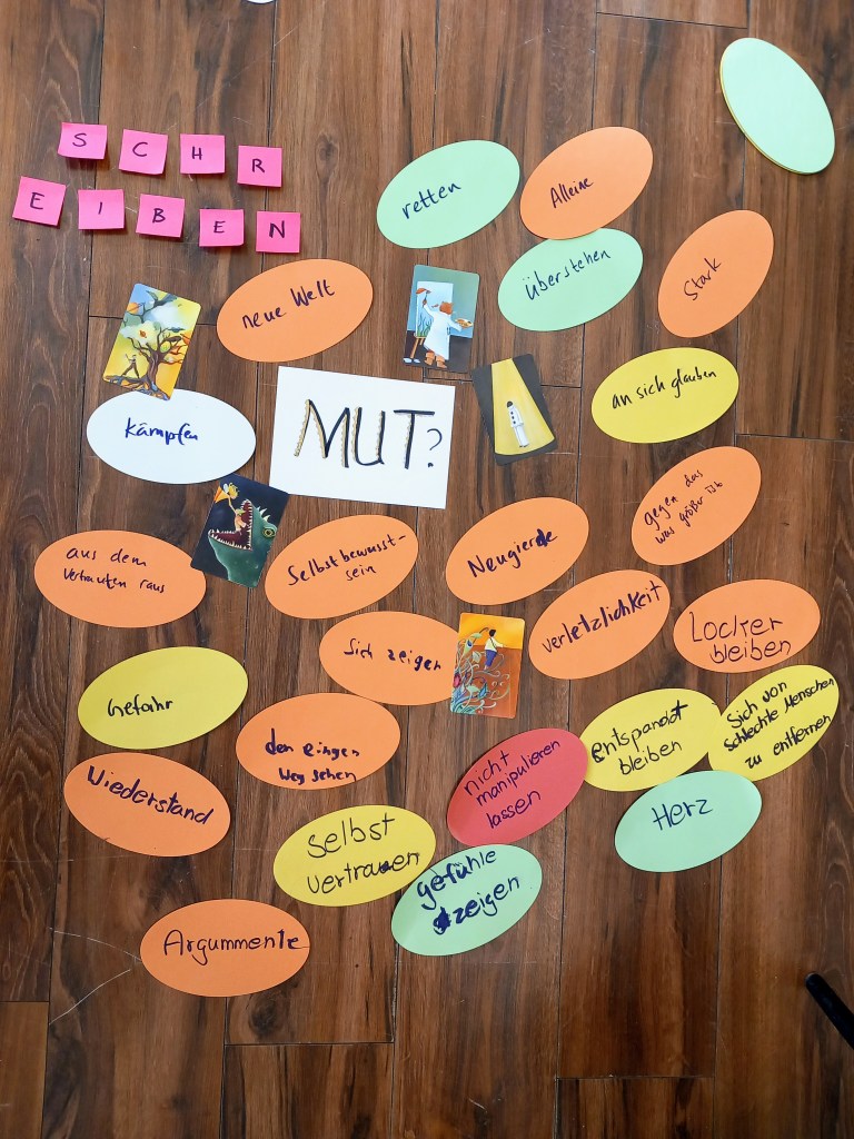 In den folgenden Workshoptagen konzentrierten wir uns intensiv auf das Konzept des Muts. Dabei stellten wir Fragen wie: Was ist eigentlich Mut? Was macht eine Person mutig? Wie zeigt sich Mut, und wen bewundern wir in unserer Lebenswelt als mutig? Unsere Erkundung des Muts erfolgte nicht nur intellektuell, sondern auch körperlich. Durch Theaterimprovisationsspiele erkundeten wir emotionale Aspekte und verbanden dies regelmäßig mit dem Assoziieren von Bildern und dem Schreiben von Geschichten über Mut. Die entstandenen Erzählungen beeindruckten und berührten gleichermaßen.